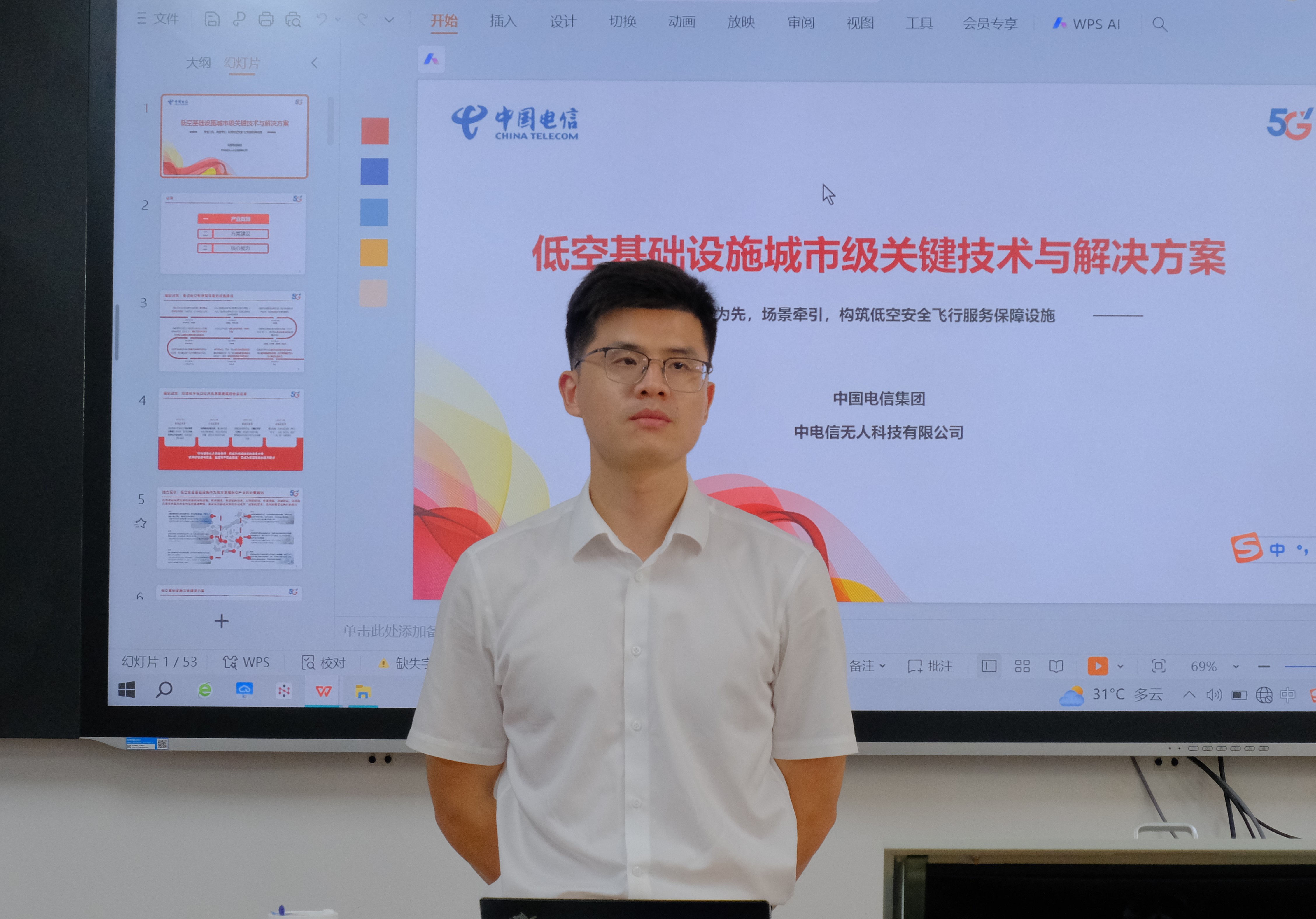 王伦总监还结合中电信无人科技最新成果,分享了基于5G+北斗的低空监视、通信、导航一体化解决方案,详细介绍了多源数据融合、空域动态管理、异常行为识别等核心技术,并通过成都、深圳等地的试点案例,展示了低空安全监管平台在应急救援、物流配送、城市巡检等场景中的实战效果,让在场师生深刻感受到前沿技术赋能低空经济的巨大潜力。