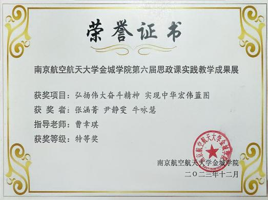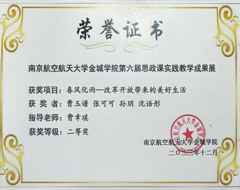 从2023年9月起,曹老师承担《思想道德与法治》的教学任务,作为新生入学后接触的第一门思政课,她深知这门课对学生坚定理想信念的重要性,她认真备好每一次课,认真上好每一次课,积极鼓励学生参加思政课教学实践成果展,最终取得了特等奖和二等奖的好成绩。