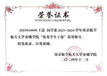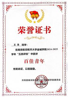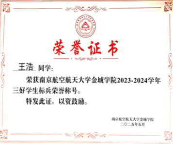王浩,男,共青团员,机电工程与自动化学院 2023 级电气工程及其自动化专业本科生,现任南航金城零度车队电控组长。 自入学以来,他始终以高标准严格要求自己,在思想淬炼、学业深耕、实践赋能、责任担当等方面全面发力,先后获得国家奖学金、校“百佳青年”、“三好学生标兵”、“优秀学生干部”、“优秀干事” 等多项荣誉称号,用青春行动诠释新时代青年的奋进姿态。