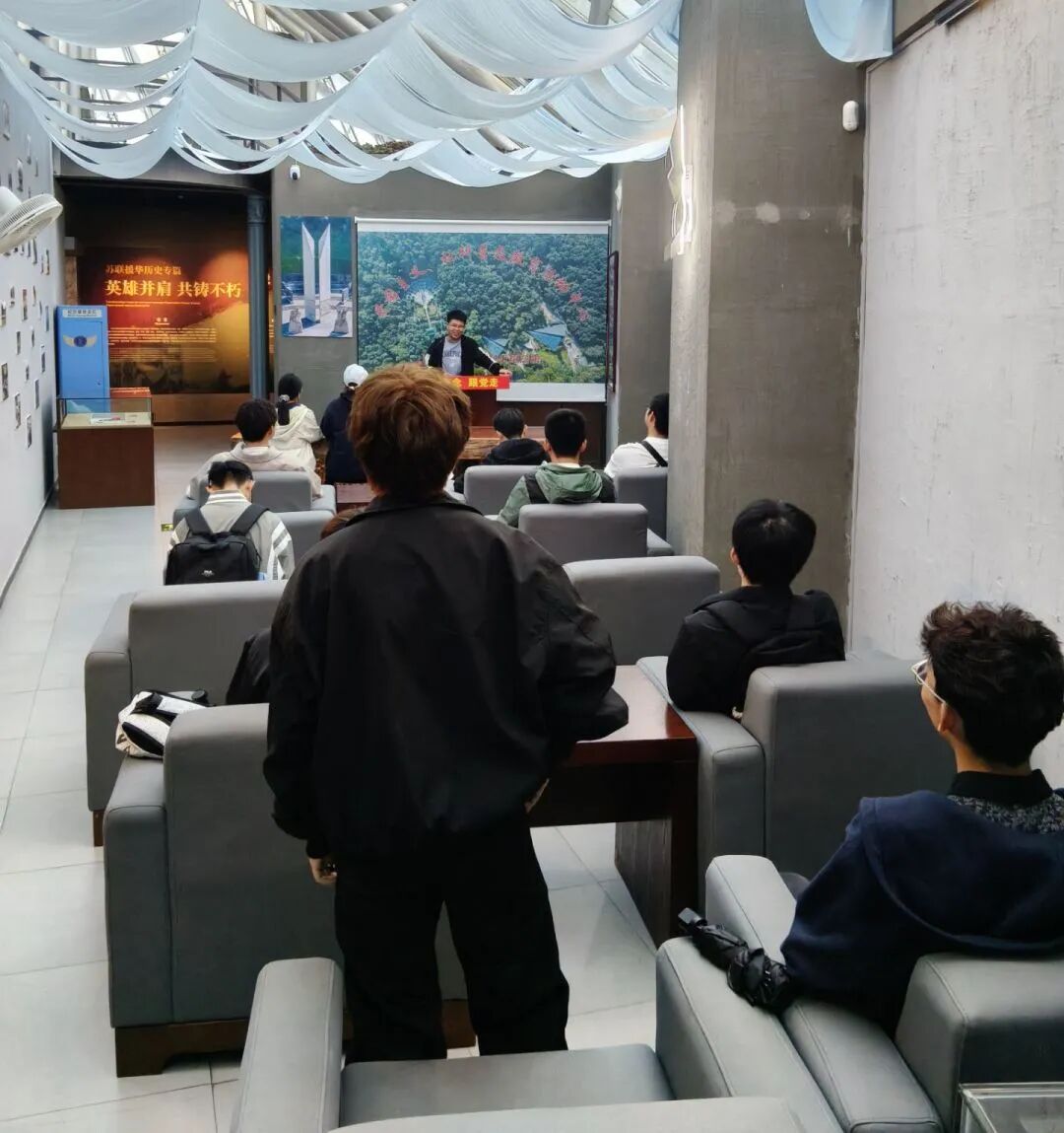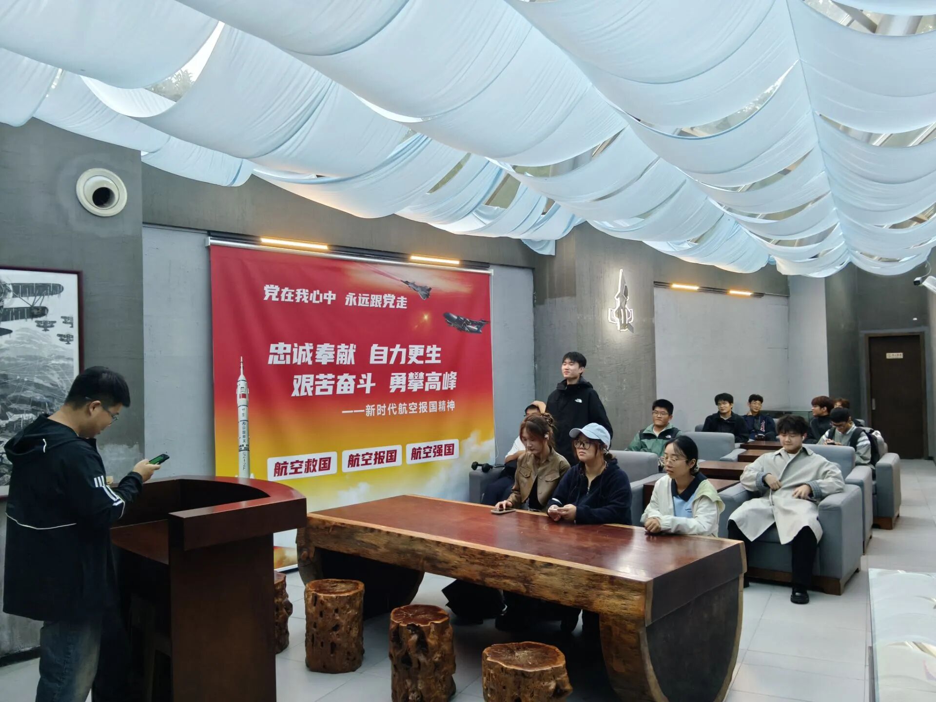 随后,在讲解员的引导下,我们开启了沉浸式参观之旅。馆内一张张泛黄的老照片、一封封字迹斑驳的家书、一件件带着历史痕迹的烈士遗物,还有逼真的场景复原和老式战机模型,都将那段艰苦卓绝的革命岁月清晰地呈现在眼前。看着烈士们穿过的飞行服、使用过的飞行仪器,听着讲解员讲述他们在蓝天之上浴血奋战、为国捐躯的故事,同学们仿佛穿越了时空,真切感受到了先烈们为了理想信念不惜抛头颅、洒热血的无畏气概。不少同学一边听一边记录,偶尔和身边的同学轻声交流感悟,内心被先烈们坚定的信念和高尚的情操深深触动。