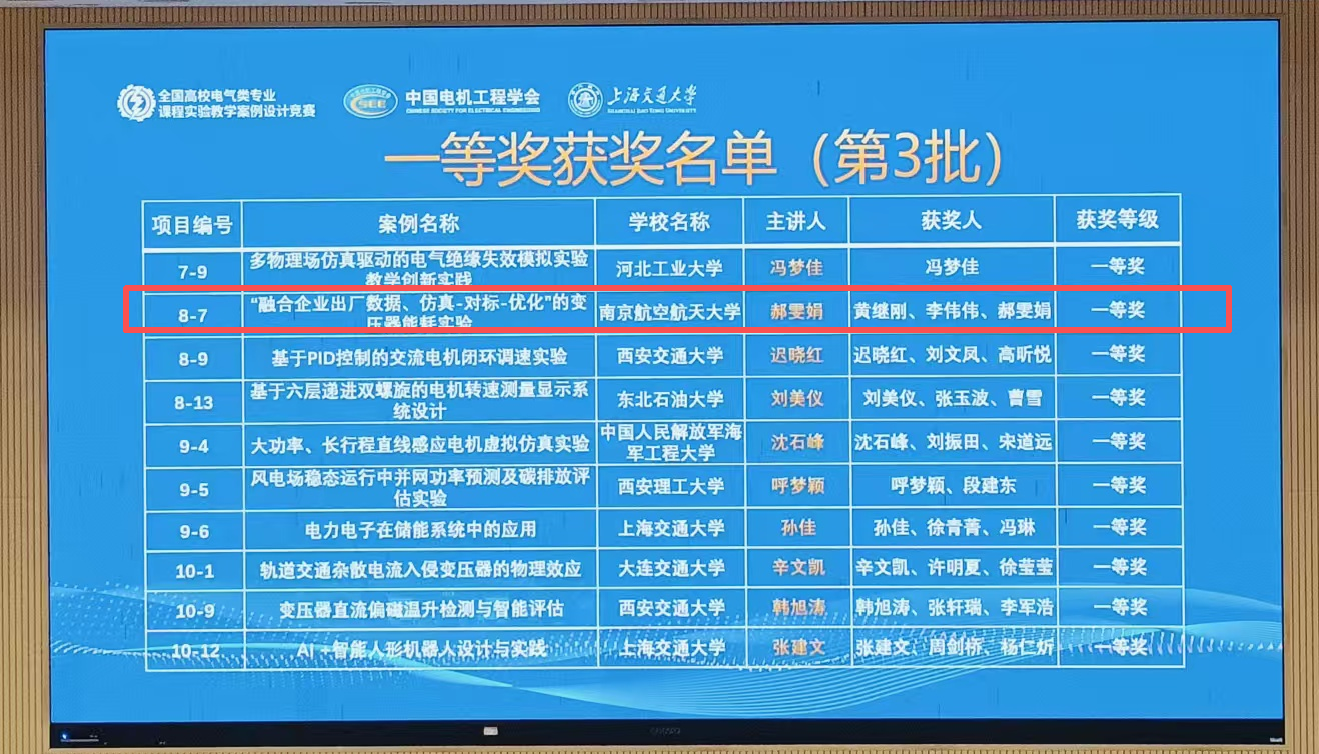2025年10月17日至19日,由教育部高等学校电气类专业教学指导委员会、中国电机工程学会和国家级实验教学示范中心联席会电子学科组联合主办的第二届全国高校电气类专业课程实验教学案例设计竞赛在上海交通大学隆重举行。南京航空航天大学金城学院绿智制造产业学院教师郝雯娟、黄继刚、李伟伟教师团队,凭借《“融合企业出厂数据、仿真-对标-优化”的变压器能耗实验》项目,从全国144支参赛队伍中脱颖而出,荣获一等奖。