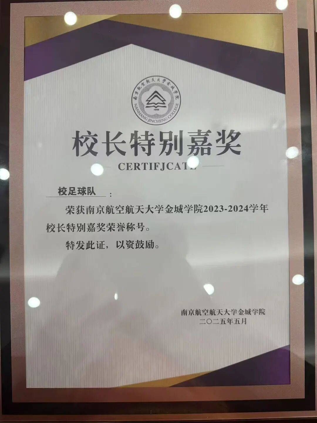 凭借在赛场上的出色表现,2024年5月,方满渊被选拔进学校足球队,成为队里的主力中后卫,有幸代表学校参加了2024“南京城市杯”南京市第一届大学生足球联赛。比赛期间,他场场打满,与团队一起拼下了亚军。2025年5月,因在各项赛事中的突出表现,学校足球队荣获“校长特别嘉奖”,这是对他与队友们努力拼搏的最高褒奖。