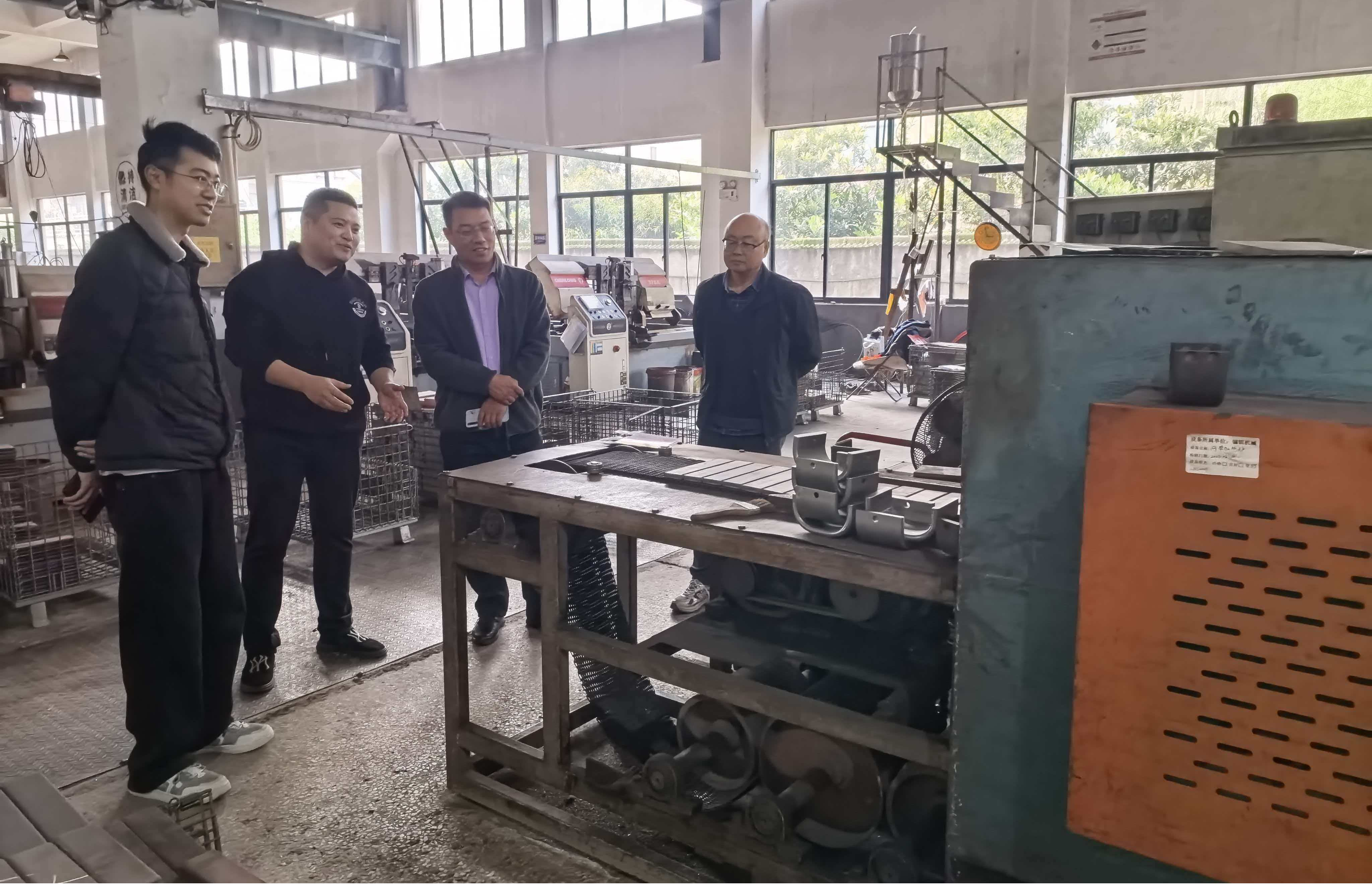 调研首站走进浙江铖镔机械科技有限公司,该企业深耕电梯核心安全部件领域,主营机械技术研发及机械设备、电梯配件等产品,年产20万件失重反馈制动U簧等核心部件,是精密制造领域的骨干企业。在企业负责人陪同下,教师团队深入生产车间,实地察看弹簧、板簧生产线,详细了解从原材料精密加工到成品高精度检测的全流程,明晰电梯制动核心部件的技术标准与质量管控要求,深刻认识到这类精密构件对电梯安全运行的关键保障作用。